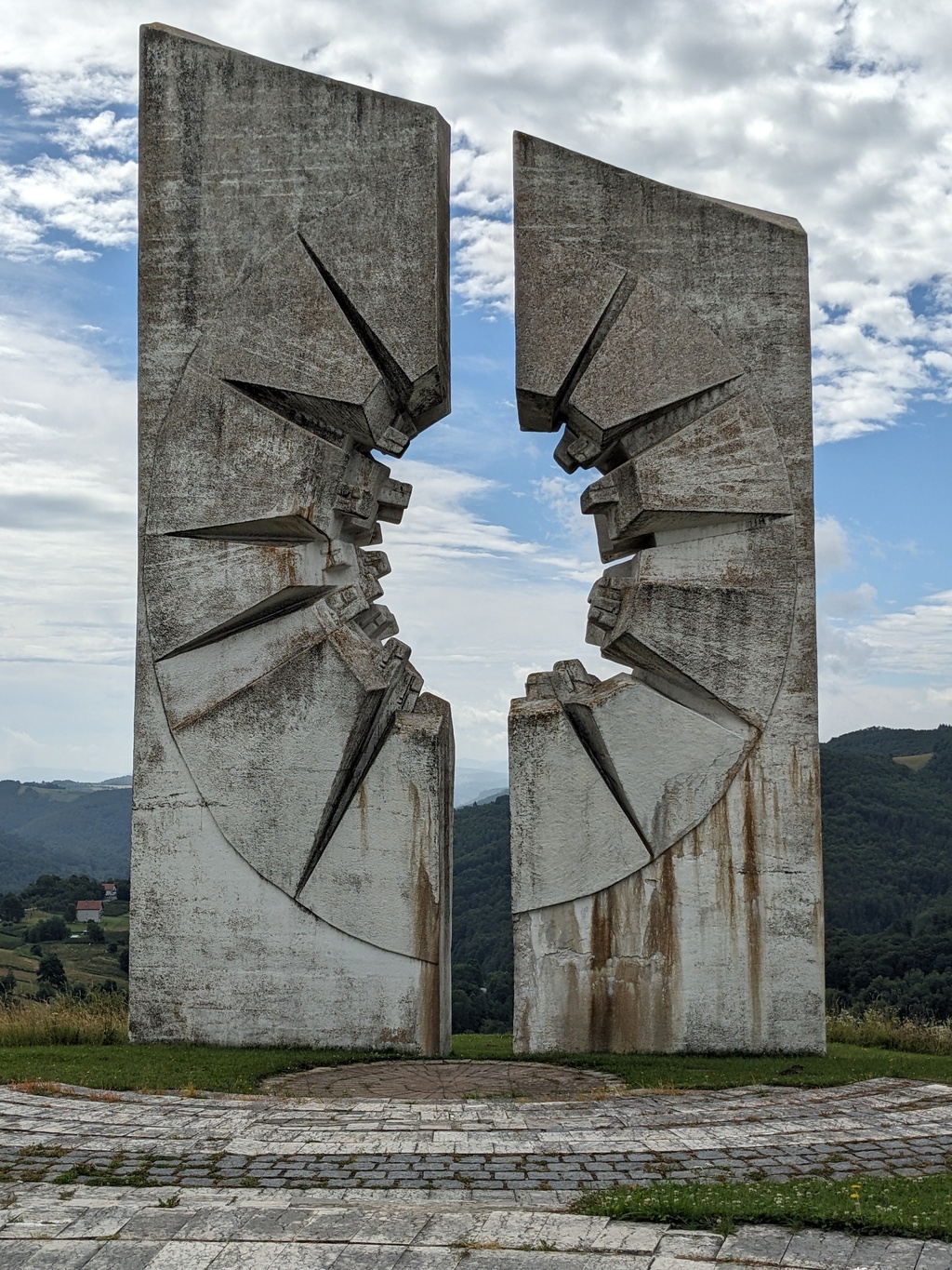 I want to head back into Bosnia. Along my planned route, there is a large war memorial 🚩 built during the communist period. It’s right beside a small airstrip, so I cannot get any shots from my drone as flying here is strictly controlled. I am alone, until a guy pulls up on a German registered bike. It’s rare to see other bikers from Germany this far south and east. He’s travelling very light, with just a small bag on his rack containing one change of clothes.